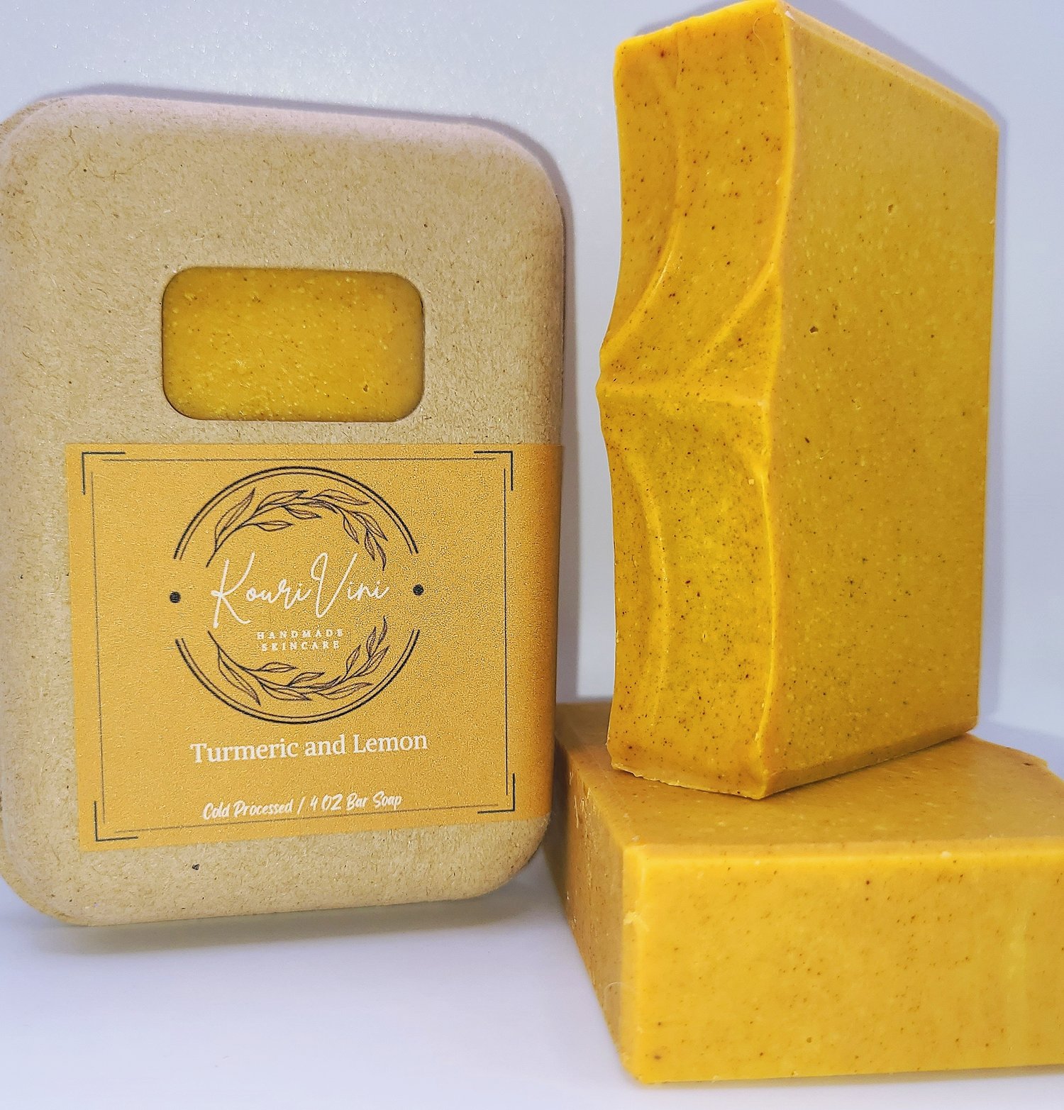 The following saponified oils of: Olive oil, Coconut Oil, Sweet Almond Oil, Shea Butter, Castor Oil, Red Palm Oil. Lemon Essential oil and Turmeric powder.